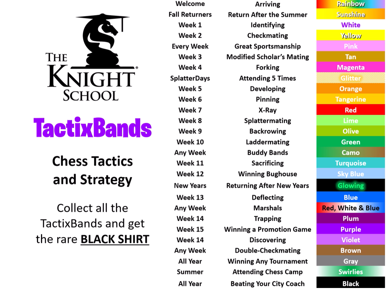 Upon enrollment, new students receive a chess set, chess bag, and all the colorful TactixBands they can earn!